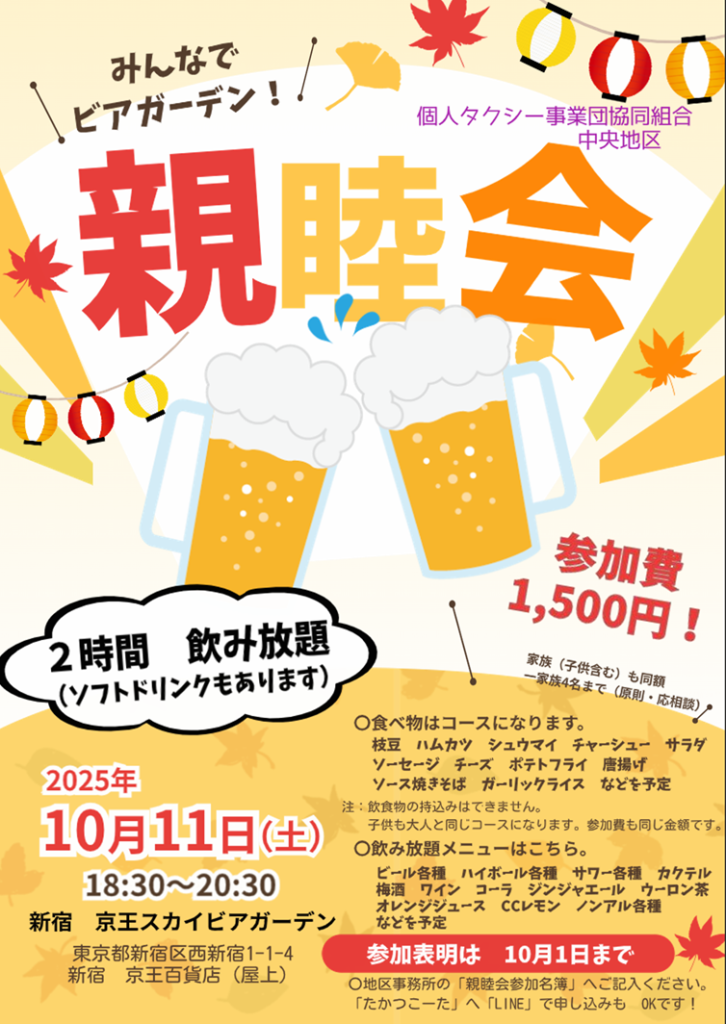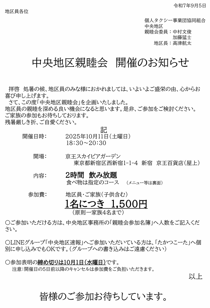 タグDiDi GO その他共有 チケット 中央地区 事務局 事務局だより 事業者健康管理 健康診断 全地区 勉強会 地区事務所 城北地区 城南地区 城東地区 情報のひろば(本部だより) 本部 無線(電脳配車) 燃油 記帳係 運輸係 選挙 全体へ公開2025.09.17中央地区 親睦会 のお知らせ